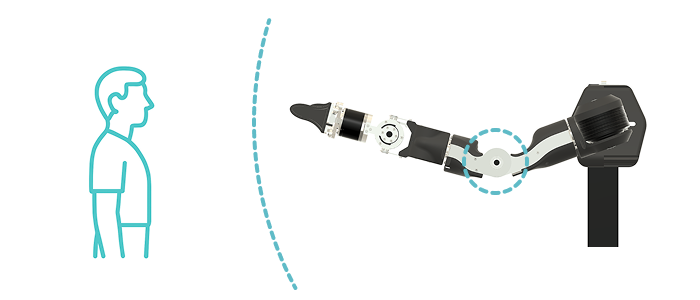 When it is unavoidable to approach the OpenArm during teleoperation, keep a safe distance from dangerous areas such as elbows, shoulders, and protruding parts of the end effector, where fingers can easily get caught.