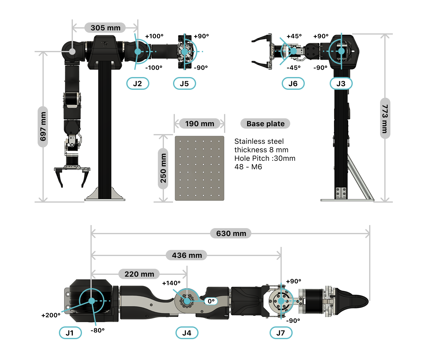 OpenArm has a small human-like physique. The support pillars are made of MiSUMi aluminum frames, making it easy to adjust the dimensions and attach cameras, sensors, and other attachments. The base plate has evenly spaced M6 taps, allowing it to be fixed directly to a table or other surface. Each joint has a mechanical limit that restricts the range of motion for safety.