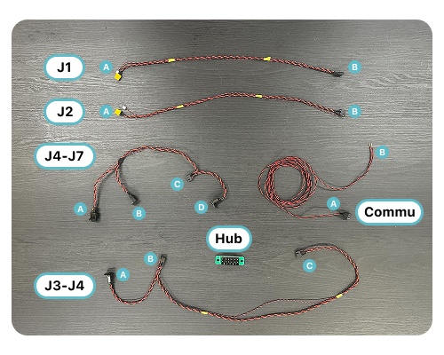 - The elements required to wire one arm are summarized in the following image. In this chapter, each cable is referred to by the name shown in the image, and the wiring process is described by the port number from A-D assigned to each cable. Note that the cables of J1 and J2 are the same component.