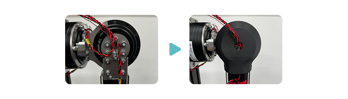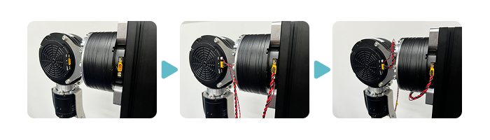 - Pass each cable through the hole in the cover of J2 while keeping the cable on the C port side of the J3-J4 cable and the cable on the B port side of the J2 cable centered on the output shaft side of the J2 motor.