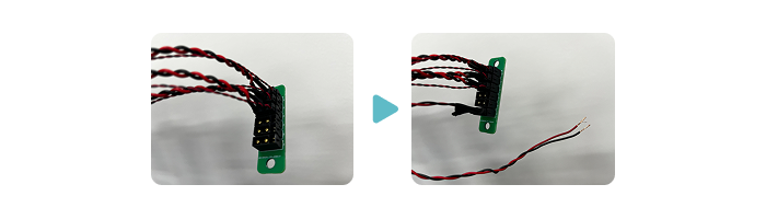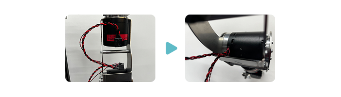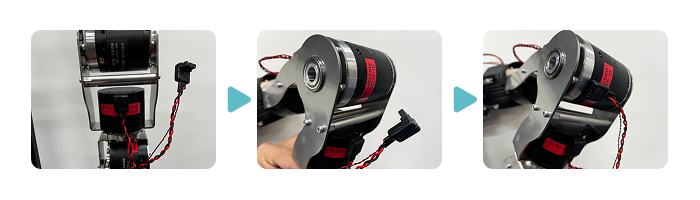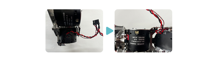 - Insert the D port of the J4-J7 cable into the port inside the arm of the J7 motor. At this time, it is easier to work by tilting the J7 motor to expose the port. Finally, insert the C port of the J4-J7 cable into the connector on the J7 motor side of the J6 motor. If it is difficult to reach, use tweezers.