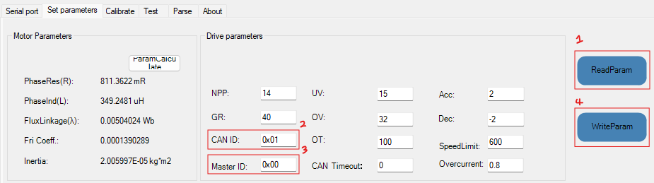 Before running any further steps, we need to first ensure that the motor sender id (CAN ID) and receiver id (MASTER ID) are configured as the table below.